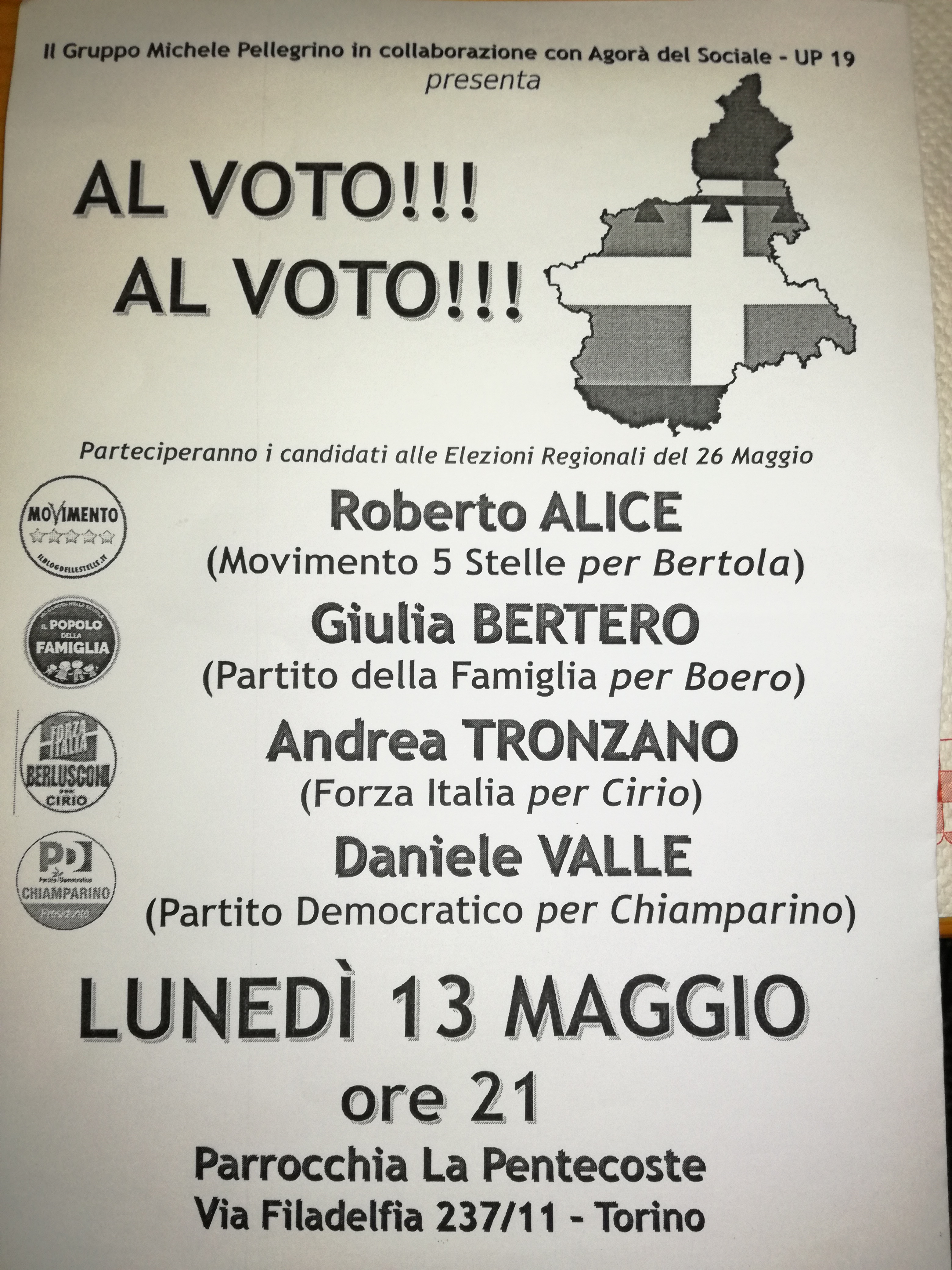 Il Gruppo Michele Pellegrino organizza per l’Unità Pastorale 19 due incontri in preparazione delle prossime elezioni del 26 maggio 2019, offrendo la possibilità di ascoltare e dialogare con i candidati delle principali formazioni politiche: