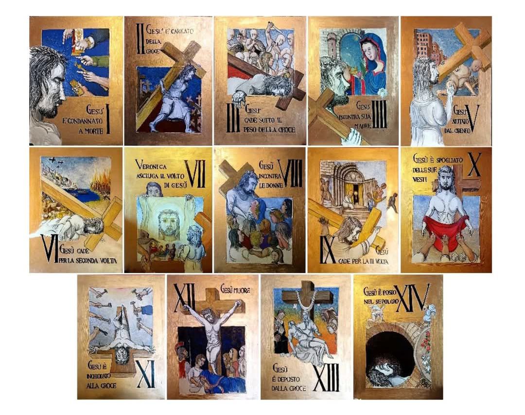 Questa Via Crucis non è un’opera d’arte ma una preghiera in punta ti pennello. Ogni pennellata è una carezza a Gesù sofferente, una riflessione sui mali che rendono pesante la sua croce e su cosa potremmo fare per alleviarli.
